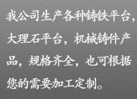 全意鑄鐵平臺平板廠家專注生產T型槽鑄鐵平臺,大理石氣浮實驗石平臺,han接鑄鐵平臺,裝配鑄鐵平臺,檢測測量大理石平臺,試驗鑄鐵平臺,測量大理石平板,T型槽平臺,電機試驗平臺,三坐標測量平臺等鑄鐵平板來圖加工定做業務,以合理的價格,專注的技術服務于國內外客戶,互利合作,共同發(fā)展!公司位于河北交河開發(fā)區,京滬鐵路、104國道、106國道、京福高速公路橫穿而過,與我國的兩大直轄市北京、天津近在咫尺,地理位置優(yōu)越,交通非常便利。我公司本著以誠納客”“嚴把質量關”“價格優(yōu)惠”“用戶至上的原則,幾十年兢兢業業,受到用戶的一致好評!